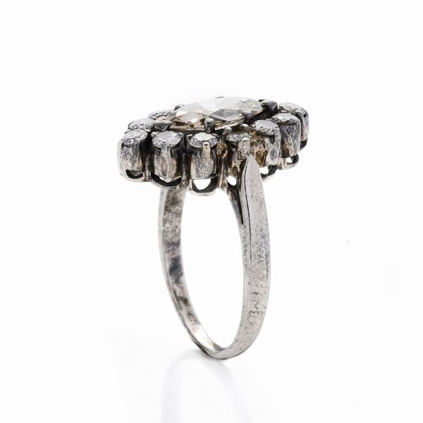 MATERIALE:oro bianco, argento, diamanti e diamante brown DESCRIZIONE: anello realizzato con un diamante fancy taglio navette incorniciato da diamanti taglio vecchio, diamante fancy presenta una frattura tra la tavola e la cintura MISURE: anello 12 PESO: diamante brown ct 1.0 circa, diamanti ct 0.60, gr 3.3