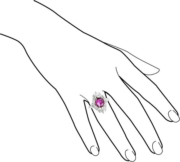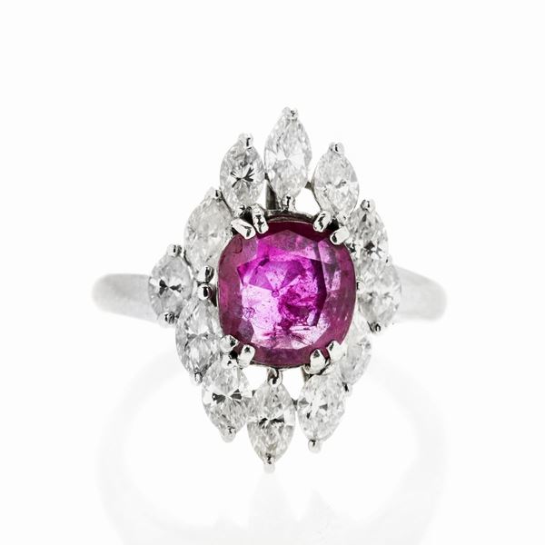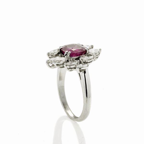MATERIALE: oro bianco, diamanti erubino DESCRIZIONE: anello con rubino taglio rotondo incorniciato con diamanti taglio navette MISURE: anello 13 PESO: rubino ct 1.80, diamanti ct 1.50, colore G-H, purezza VS, gr 8.5