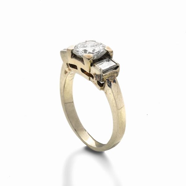 MATERIALE: oro bianco e diamanti DESCRIZIONE: anello realizzato con al centro un diamante taglio brillante tra due diamanti taglio baguette MISURE: anello 6 PESO: diamante centrale ct 1.0, colore H, purezza VS, diamanti laterali ct 0.40, colore H, purezza VS, gr 3,8