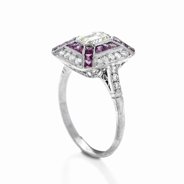 MATERIALE: oro bianco, rubini, diamanti e diamante giallo DESCRIZIONE: anello di ispirazione geometrica realizzato con diamante giallo taglio smeraldo incornicato da rubini taglio quadrato e diamanti taglio vecchio che continuano anche sui lati MISUE: anello 17 PESO: diamante taglio smeraldo ct 0.90, colore Q-R, purezza SI, diaamnti laterali ct 0.16, rubini ct 0.60, gr 4.9