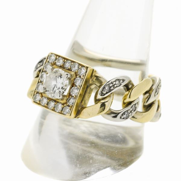 MATERIALE: oro giallo, oro bianco e diamanti DESCRIZIONE: anello realizzato con diamante taglio brillante in una cornice quadrata impreziosita con diamanti taglio brillante, fascia con maglie a barbazzale MISURE: anello 22 PESO: diamante centrale ct 0.75, colore H-I, purezza SI, diamanti laterali ct 0.30, gr 12.9