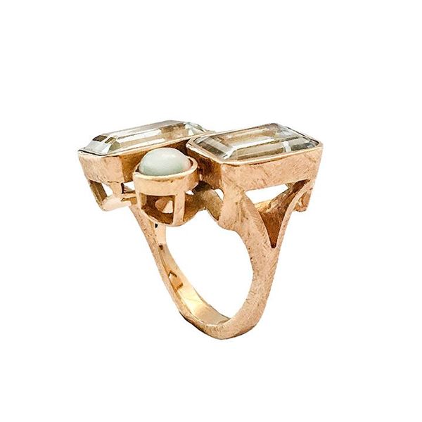 MATERIALE: oro rosa, opale e acquamarina DESCRIZIONE: anello di ispirazione geometrica, realizzato con due acquamarina di taglio rettangolare sfalzate ed impreziosite con un opale, montatura in oro rosa satinato, reca il marchio 750 MISURE: anello 14 PESO: acquamarina ct 11.60 totali, gr 12.7
