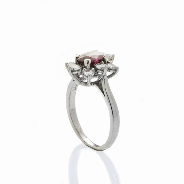 MATERIALE: platino, diamanti e rubino DESCRIZIONE: anello realizzato con rubino ovale incorniciato da diamanti taglio brillante, reca inciso il numero 141 MISURE: anello 12 PESO: rubino ct 1.10, diamanti ct 0.60, gr 5.6