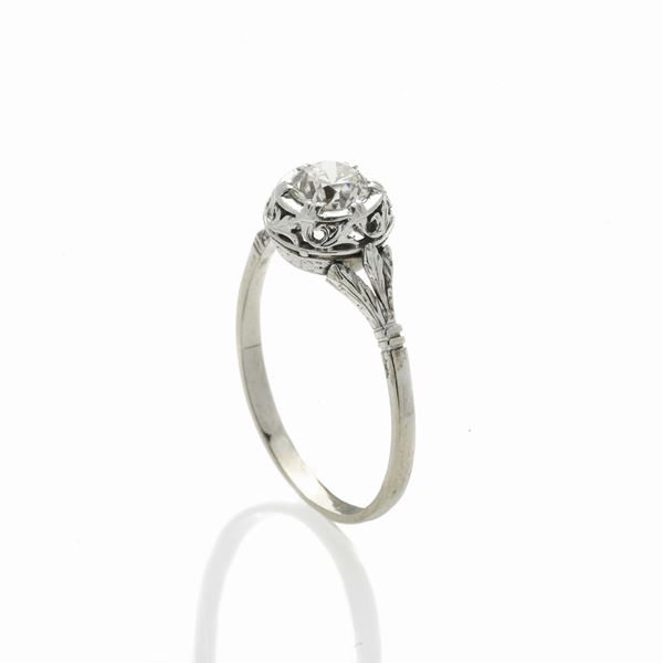 MATERIALE: oro bianco e diamante DESCRIZIONE: anello solitario con diamante taglio vecchio su alta base realizzata con volute contrapposte e foglie che continuano sui lati MISURE: anello 20 PESO: diamante ct 0.60, colore L, purezza VS, gr 2.6