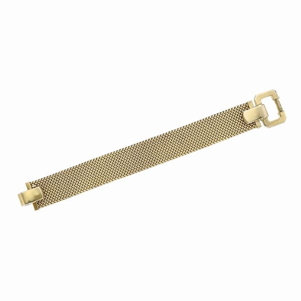 MATERIALE: oro giallo DESCRIZIONE: bracciale realizzato come una cintura con grande fermezza rettangolare, reca il marchio 750 MISURE: aperto cm 18.5 PESO: gr 52.5