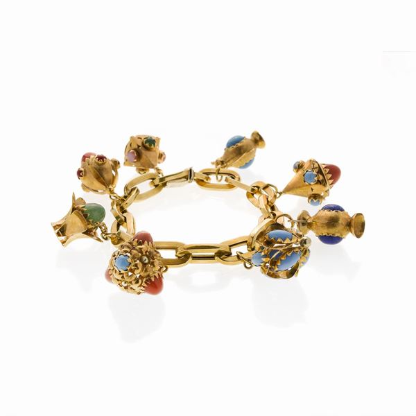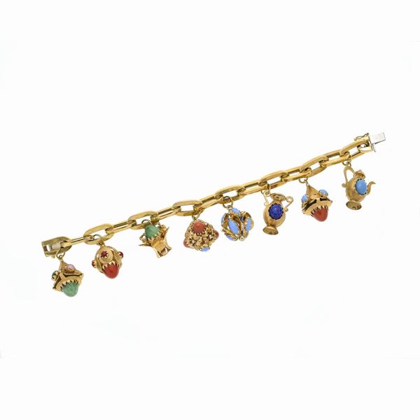 MATERIALE: oro giallo, corallo, turchese, pietre verdi e lapislazzulo DESCRIZIONE: btracciale realizzato con maglie intrecciate ovali impreziosito con otto charms di forme diverse con pietre dure, il bracciale reca il marchio 750 MISURE: aperto cm 19.5 PESO: gr 53.7