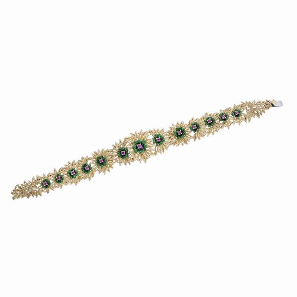 MATERIALE: oro giallo, smalto verde e rubini DESCRIZIONE: bracciale realizzato come una teoria di fiori degradè, ciascuno lumeggiato in smalto verde e impreziosito con rubino MISURE: aperto cm 18 PESO: gr 51.6