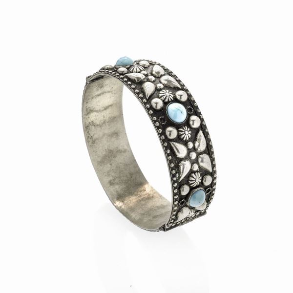 MATERIALE: argento e turchesi DESCRIZIONE: bracciale rigido impreziosito con fiori e borchie sbalzate alternate con turchesi taglio cabochon MISURE: diametro interno cm 6.5 PESO: gr 36.7