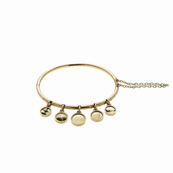 MATERIALE: oro giallo e cammei DESCRIZIONE: bracciale rigido impreziosito da cinque cammei come charms, reca un punzone di difficile lettura MISURE: diametro interno cm 5.8 PESO: gr 12.0