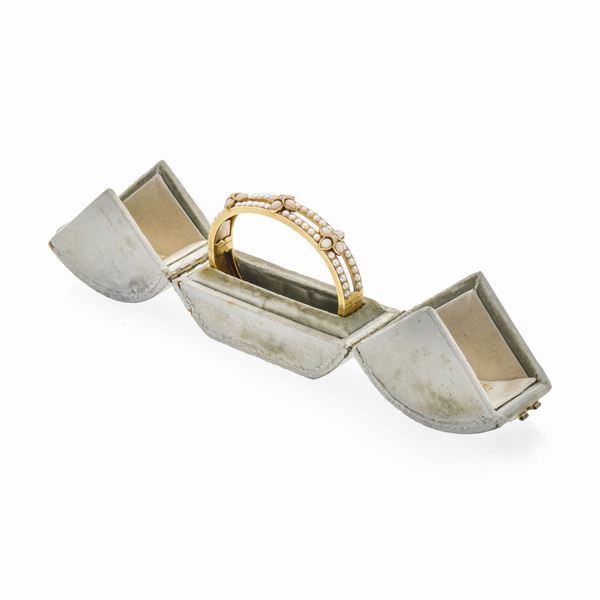 Bracciale rigido in oro giallo, corallo rosa, diamanti e perle
