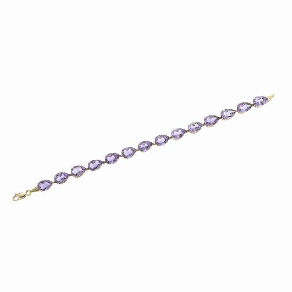MATERIALE: oro giallo 10 kt e ametista DESCRIZIONE: bracciale realizzato con quattordici ametiste taglio goccia montate in oro giallo, reca il marchio 10 kt MISURE: aperto cm 18.5 PESO: gr 9.2
