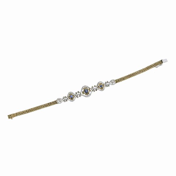 MATERIALE: oro giallo, oro bianco, diamanti e zaffiri DESCRIZIONE: braccialetto realizzato con al centro tre zaffiri di taglio ovale incorniciati con diamanti taglio brillante, bracciale con doppia maglia in oro giallo, firmato Unoaerre, reca il marchio 750 MISURE: aperto cm 18.5 PESO: gr 19.9