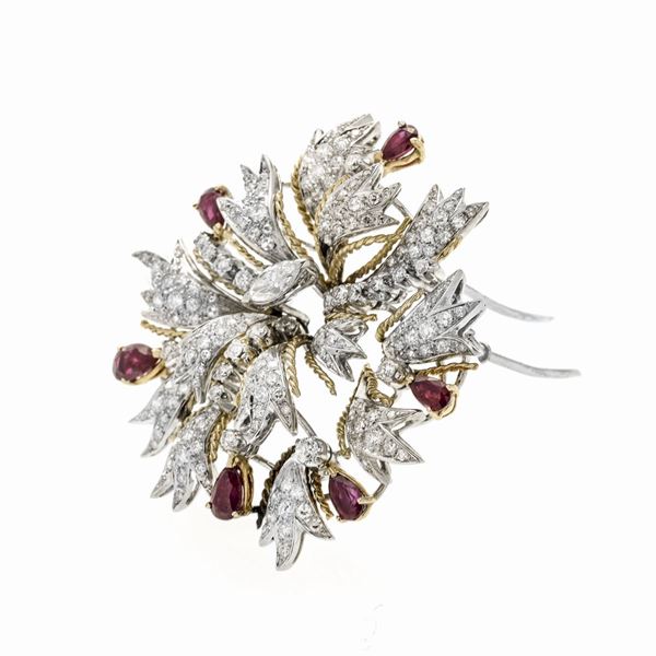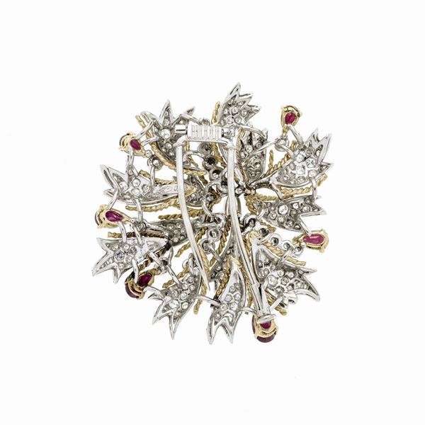 Clip Fiore in oro giallo, oro bianco, diamanti e rubini