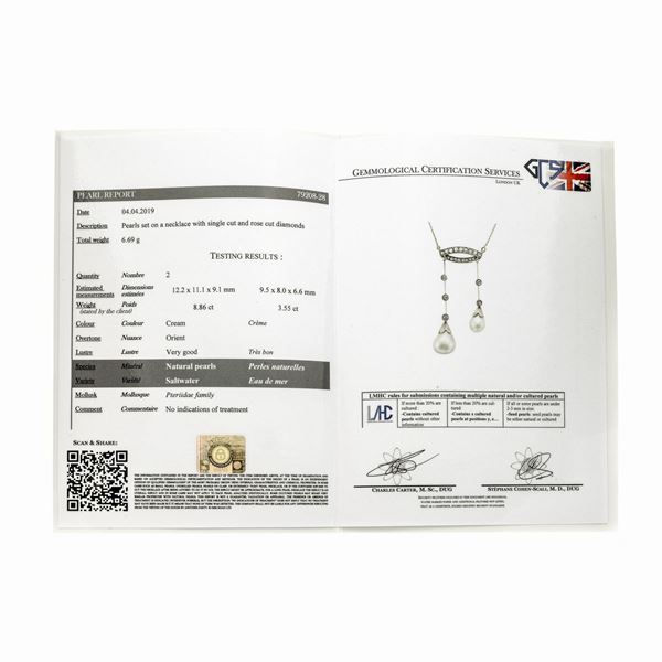 MATERIALE: oro, argento, diamanti e perle naturali con certificato DESCRIZIONE: collana realizzata con catena a maglie intreccite e al centro pendente realizzato come una corona stilizzata con rose di diamante e due barrette impreziosite con diamanti taglio vecchio e due grandi perle scaramazze naturali pendenti MISURE: pendente cm 2.2x 5.2 PESO. perle mm 12.2 x11.1x 9.1 e 9.5x8.0x6.6, gr 6.6