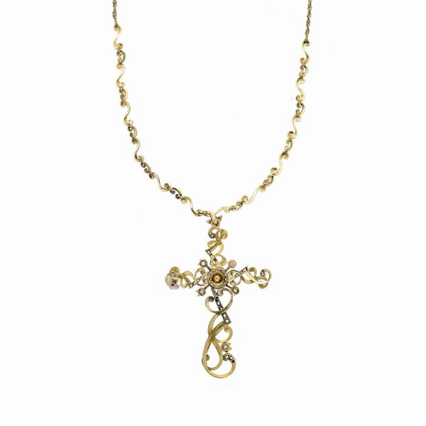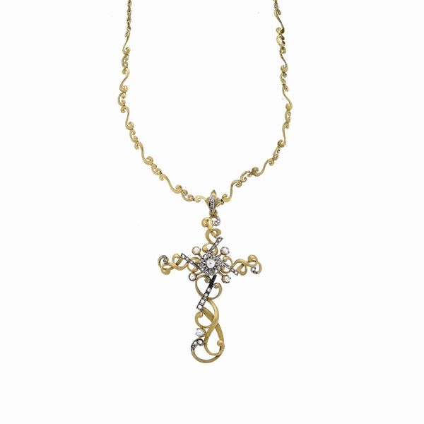 MATERIALE: oro giallo, argento, diamanti e perle DESCRIZIONE: grande croce realizzata con volute contrapposte in oro giallo impreziosite con parti in argento e rose di diamanti, al centro un fiore centrato da perla e incornciato con rose di diamante, corredata di catena en suite MISURE: croce cm 5.5x 9.5 h, catena aperta cm 62.5 PESO: gr 29.3