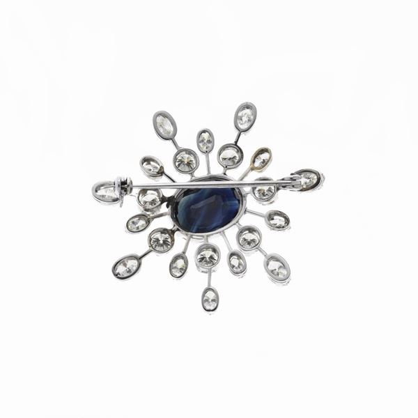 MATERIALE: oro bianco, diamanti e zaffiro DESCRIZIONE: spilla realizzata come un fiore con zaffiro taglio ovale incornciato da diamanti taglio brillante e taglio navette MISURE: cm 3.5x4.2h PESO: zaffiro ct 5.0, diamanti ct 3.60, colore H e J, purezza VS-SI, gr 9.0