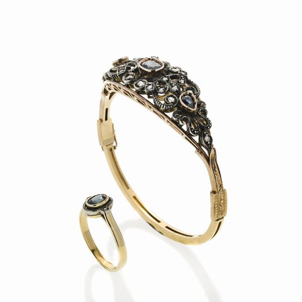 MATERIALE:oro giallo, argento, diamanti e zaffiri DESCRIZIONE: bracciale rigido realizzato con volute contrapposte impreziosite da tre zaffiri taglio ovale e rose di diamante e anello simile, recano il marchio 750 MISURE: bracciale chiuso diametro cm 5.8, anello 23 PESO: gr 33.3