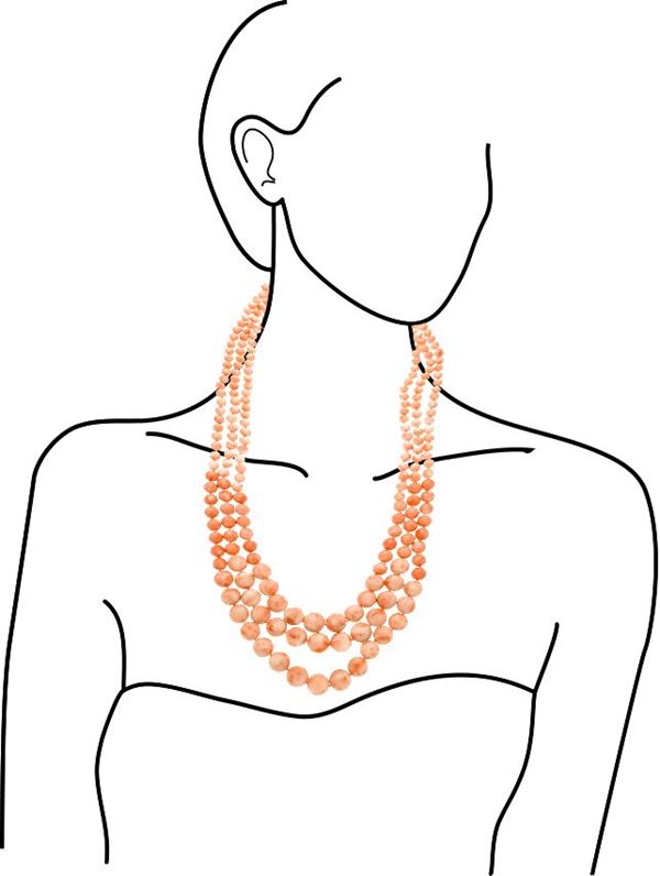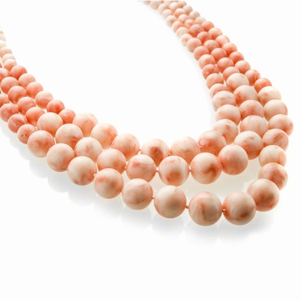 MATERIALE: oro giallo e corallo rosa DESCRIZIONE: lunga collana realizzata con tre fili di perle in corallo rosa degradè, fermezza tubolare in oro giallo, reca il marchio 750 MISURE: aperta cm 77.5 PESO: corallo da mm 6 a 13.5, gr 261.3