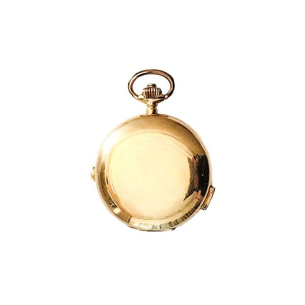 MATERIALE: oro giallo DESCRIZIONE: orologio cronometro da tasca con doppia cassa in oro giallo, quella posteriore con iniziali GA in oro, quadrante in smalto bianco con numeri arabi, lancette douphine, quadrante ausiliario ad ore 6, movimento a carica manuale, reca il marchio 18 kt MISURE: diametro mm 53 PESO: gr 102.5