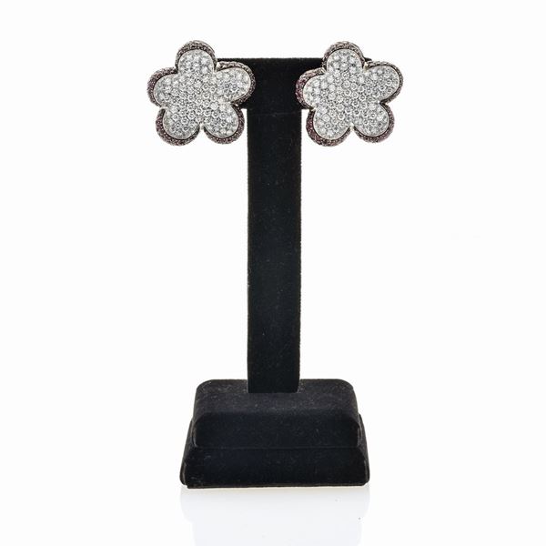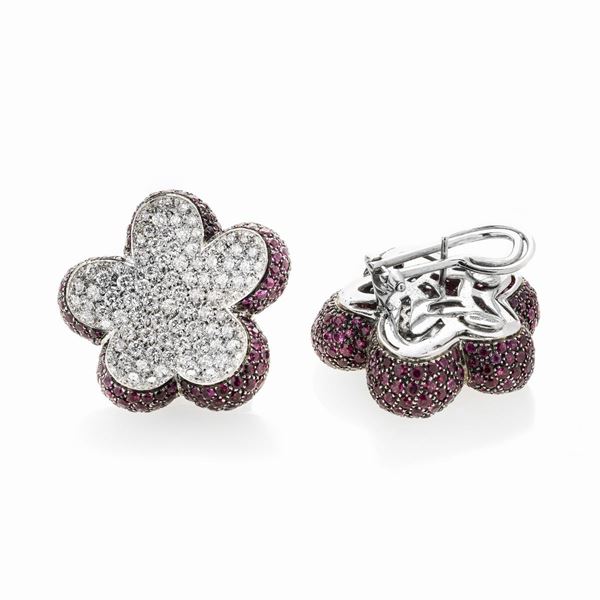 Paio di orecchini a clips in oro bianco, diamanti e rubini