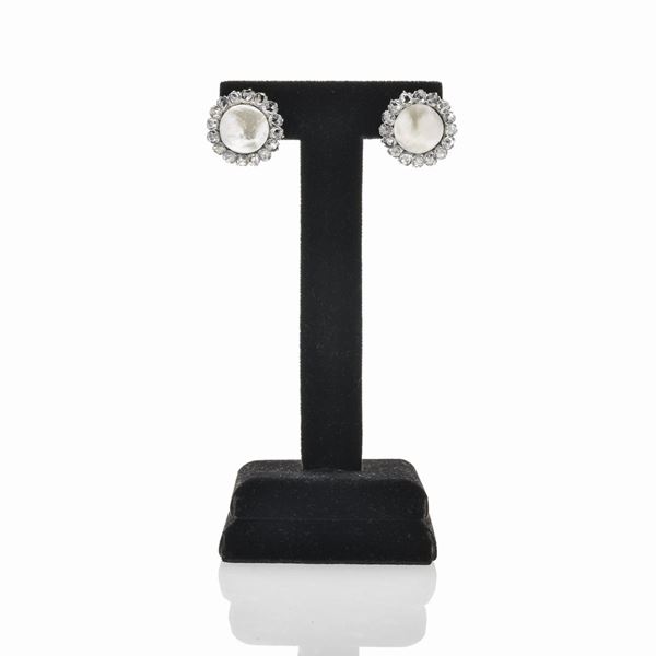MATERIALE: oro giallo, argento diamanti e perle mabè naturali DESCRIZIONE: paio di orecchini a clips, ciascuno realizzato con grande perla mabè incirnciata da rose di diamanti MISURE: diametro cm 2 PESO: perle mabè naturali mm 12.5x12.2x7.4 e 12.5x12.3x6.5, corredate di certificato Gemmological Certification Services n 77106-10, del 02.06.2017