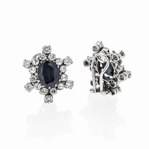 Paio di orecchini in oro bianco, diamanti e zaffiro