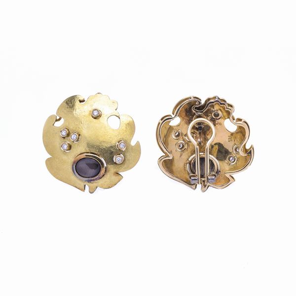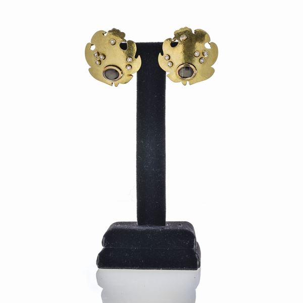 Paio di orecchini in oro giallo, diamanti e occhio di tigre