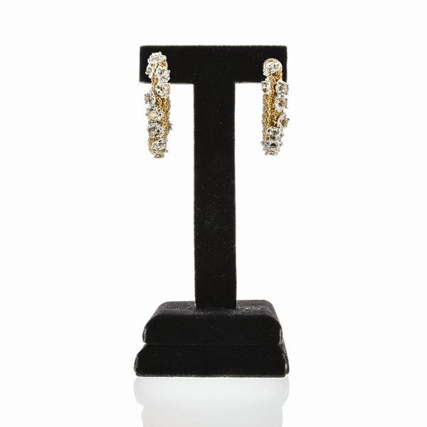 Paio di orecchini in oro giallo, oro bianco, diamanti e diamanti brown