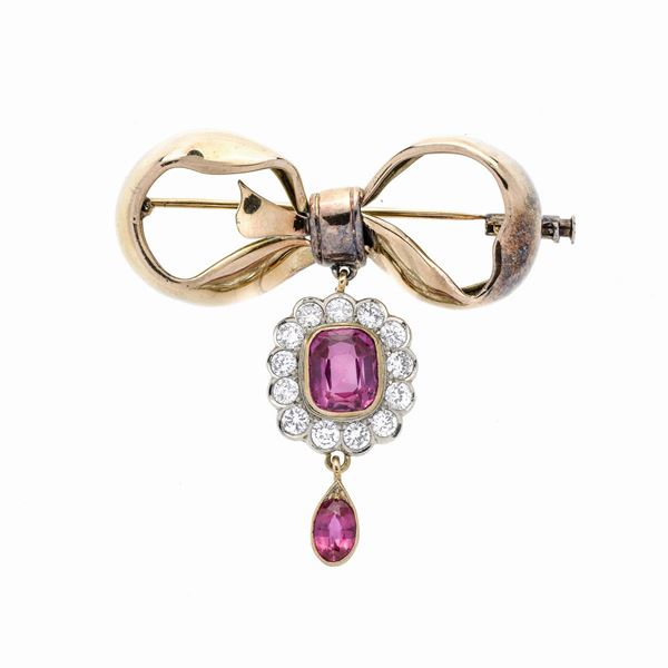 MATERIALE: oro giallo, oro bianco, diamanti e pietre rosse sintetiche DESCRIZIONE: parure composta d aspilla realizzata come un fiocco con margherita pendnete centrata da pietra rossa sintetica incorniciata con diamanti taglio brillante, paio di orecchini ed anello en suite MISURE: spilla cm 4.5x 5.0h, anello 16.5 PESO: gr 38.8