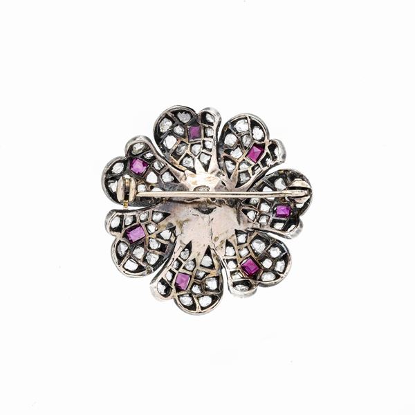 Spilla Fiore in oro a basso titolo, argento, diamanti, rubini e perla