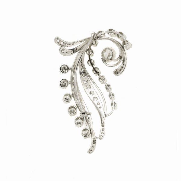 MATERIALE: oro bianco e diamanti DESCRIZIONE: spilla realizzata come una grande foglia interamente impreziosta con diamanti taglio vecchio, taglio brillante e taglio huit huit MISURE: cm 3x 5.2h PESO: diamanti ct 2.80, colore H, purezza SI, gr 9.6