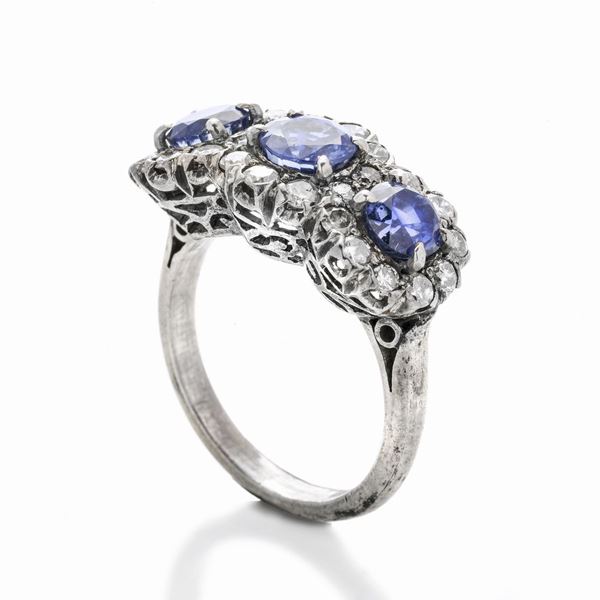 MATERIALE: oro bianco, argento, diamanti e zaffiri DESCRIZIONE: anello realizzato con tre zaffiri ciascuno incorniciato da diamanti taglio vecchio, su alta base a tricot MISURE: anello 15 PESO: zaffiri ct 2.90, diamanti ct 0.80, colore H, purezza P1, gr 6.1