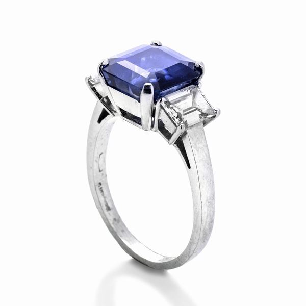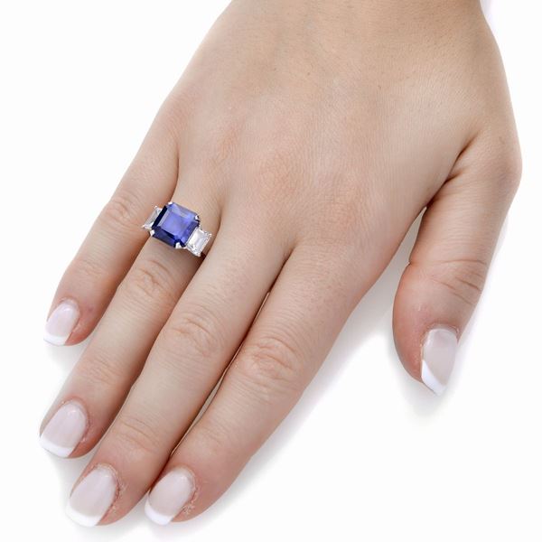 MATERIALE: oro bianco, diamanti e zaffiro DESCRIZIONE: anello realizzato con al centro uno zaffiro taglio quadrato, tra due diamanti taglio baguette, firmato Veronesi MISURE: anello 15 PESO: zaffiro ct 6.40, diamanti ct 0.70 l'uno, H- VS, gr 6.1