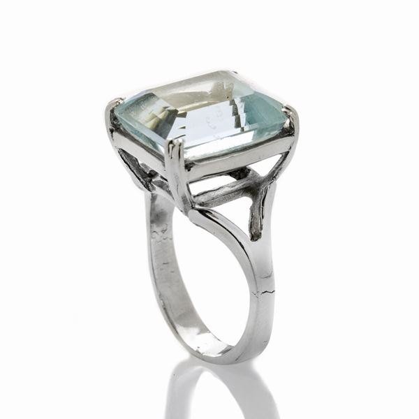 MATERIALE: oro bianco e acquamarina DESCRIZIONE: anello con grande acquamarina taglio smeraldo MISURE: anello 8 PESO: acquamarina ct 7.50, gr 6.6