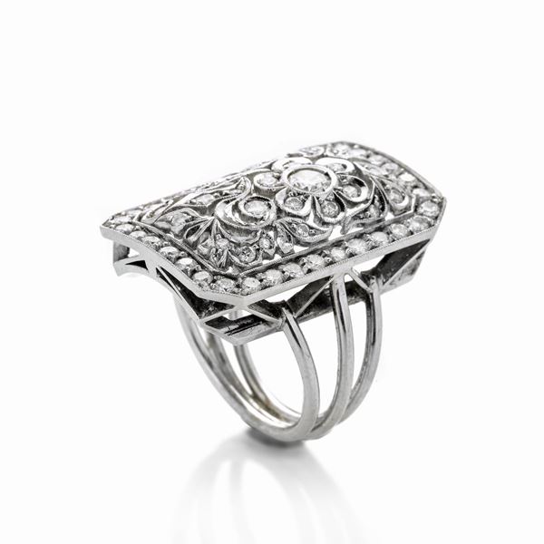 MATERIALE: oro bianco e diamanti DESCRIZIONE: anello di ispirazione floreale realizzato a tricot interamente impreziosito da diamanti taglio brillante MISURE: anello 12.5 PESO: gr 9.5