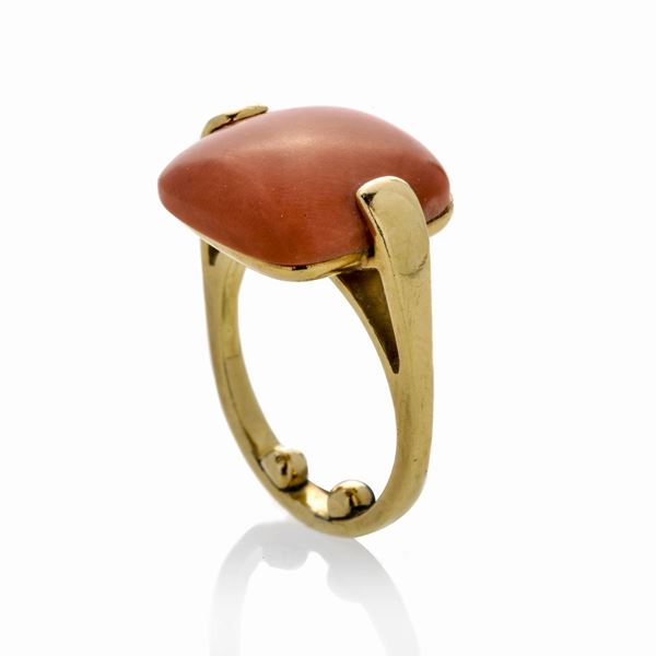 MATERIALE: oro giallo e corallo rosso DESCRIZIONE: anello con grande corallo rosso taglio cabochon quadrato, reca marchio 750 MISURE: anello 7 PESO: gr 6.7
