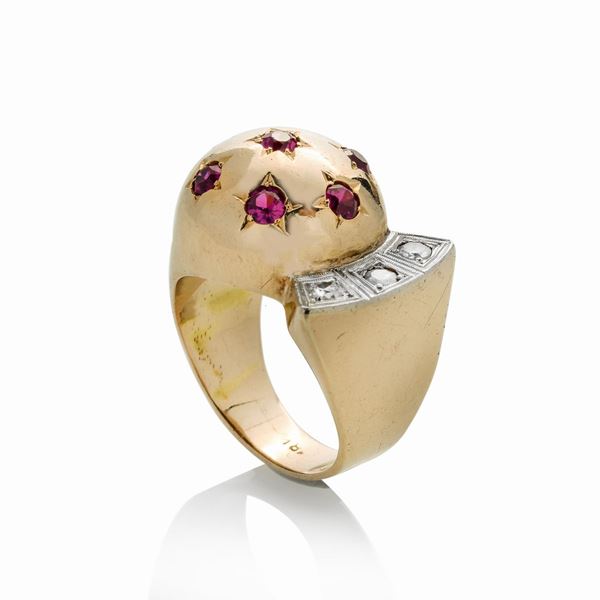 Anello in oro giallo, oro bianco, diamanti e pietre rosse