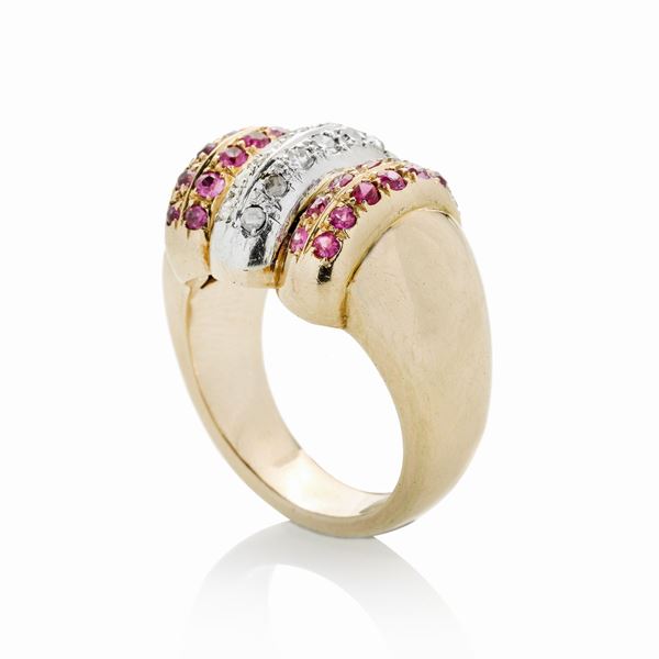 Anello in oro rosa, oro bianco, diamanti e pietre rosse