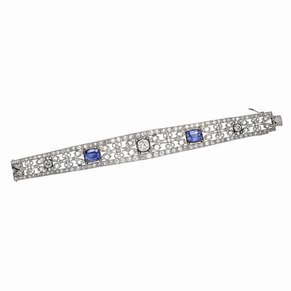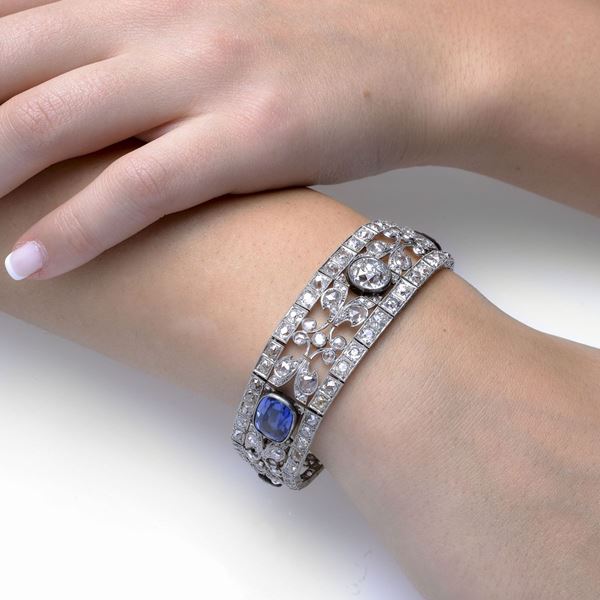 MATERIALE: oro bianco, diamanti e pietre blu sintetiche DESCRIZIONE: bracciale leggermente sagomato, di ispirazione floreale, realizzato a tricot, con al centro un grande diamante taglio veccchio tra due pietre blu di taglio ovale, incorniciati con tralci di foglie impreziosite da rose di diamante e diamanti taglio vecchio MISURE: aperto cm 19 PESO: diamante taglio vecchio centrale ct 3, J- P1, due diamanti taglio vecchio laterali ct 0.80 complessivi I-J, SI2-P1, i restanti diamanti complessivi ct 7.0, gr 41.7