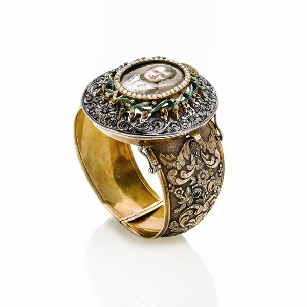 Bracciale in oro giallo, oro a basso titolo, argento, microperle, smalti, diamanti e miniatura
