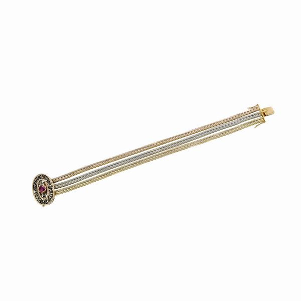 MATERIALE: oro giallo, oro bianco, oro rosa e rubini DESCRIZIONE: bracciale realizzato con tre piccoli bracciali a maglie intrecciate, in colori diversi dell'oro, con grande fermezza ovale, eseguita a tricot, con rubino tra girali di foglie MISURE: aperto cm 19 PESO: gr 42.4