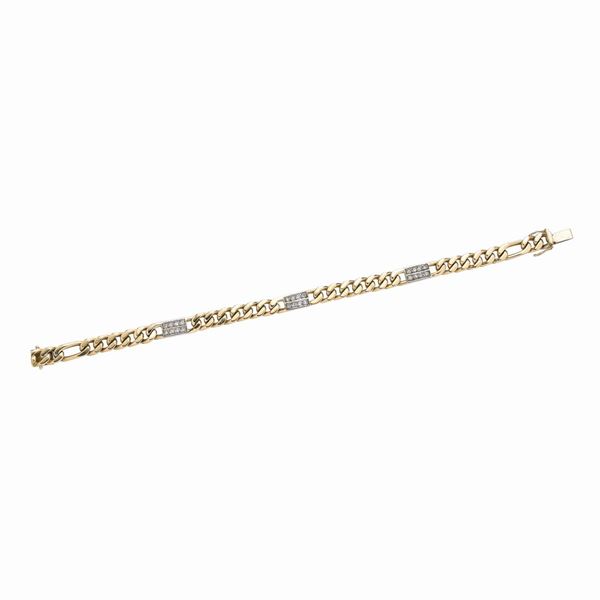 MATERIALE: oro giallo, oro bianco e diamanti DESCRIZIONE: braccialetto realizzato con maglie a barbazzale alterante a barrette in oro bianco, ciascuna impreziosita con diamanti taglio brilante, reca il marchio 750, en suite con la collana precedente MISURE: aperto cm 19.5 PESO: gr 29.2