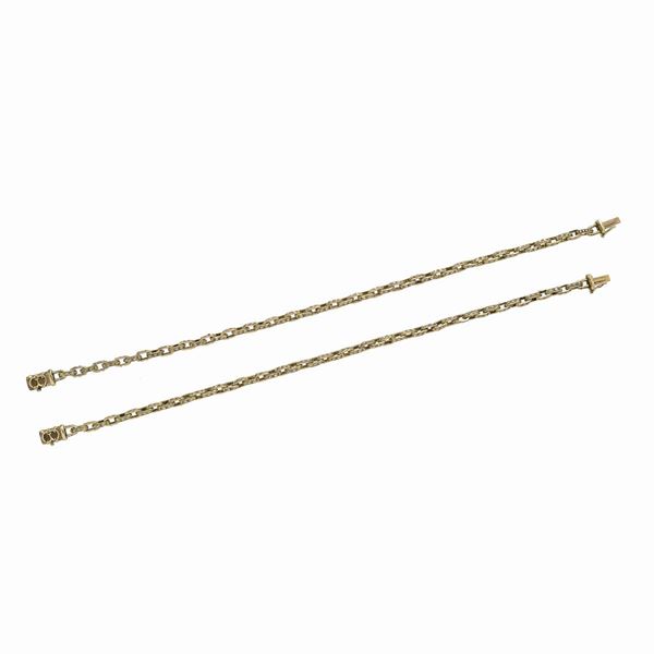 MATERIALE: oro giallo DESCRIZIONE: girocollo trasformabile in due bracciali ciascuno realizzato a maglie ovali intrecciate tra loro con teoria di foglie lanceolate, firmato Buccellati MISURE: collana aperta cm 42.4, bracciale aperto ciascuno cm 21.2 e 22 PESO: gr 29.1