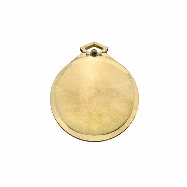 MATERIALE: oro giallo e rubini DESCRIZIONE: orologio da frac con cassa in oro giallo e rubini taglio carrè lungo tutta la circonferenza, quadrante in smalto bianco con numeri arabi e indici alternati, lancette blu douphine, movimento a carica manuale, reca marchio di importanzione francese MISURE: diametro mm 42 PESO: gr 39.1