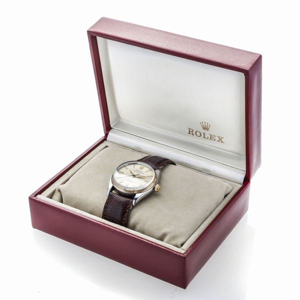MATERIALE: acciaio e oro giallo DESCRIZIONE: orologio con corona a vite, lunetta zigrinata e corona in oro giallo, cassa oyster in acciaio, quadrante champagne con indici applicati, lancette alpha, movimento a carica automatica, cinturino in pelle marrone stampata MISURE: quadrante mm 33