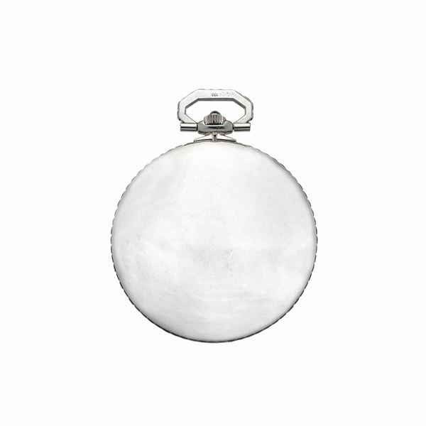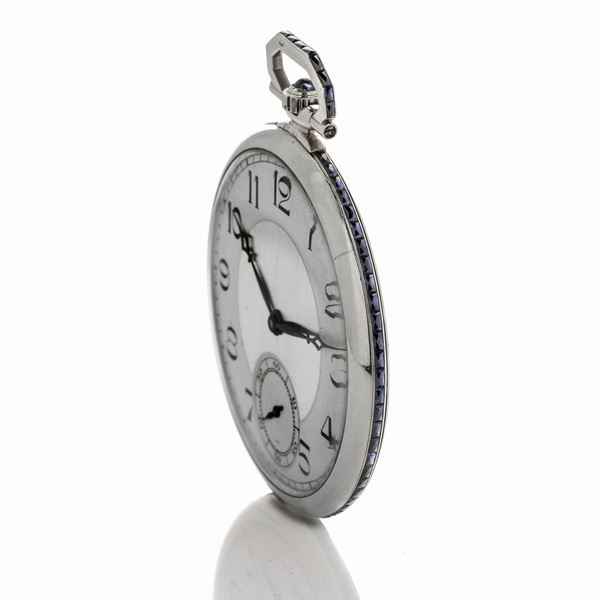 MATERIALE: oro bianco e zaffiri DESCRIZIONE: orologio da tasca ultrapiatto con cassa in oro bianco e zaffiri taglio carrè lungo tutta la circonferenza, quadrante in oro bianco e smalto con numeri arabi, lancette cathedral, quadrante supplemantare ad ore sei, movimento a carica manuale, reca marchio di importazione francese MISURE: diametro cm 4.4 PESO: gr 40.5