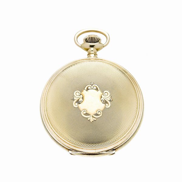 MATERIALE: oro giallo 14 kt DESCRIZIONE: orologio da tasca con doppia cassa in oro giallo, quadrante in smalto bianco con numeri romani e lancette a spada, quadrante ausiliario ad ore sei, movimento a carica manuale, cassa anteriore incisa con cartiglio MISURE: diametro cm 5.2 PESO: gr 113.1