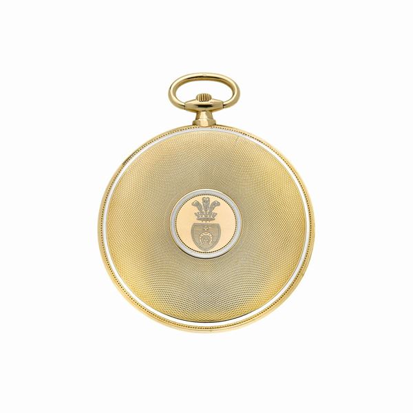 MATERIALE: oro giallo e smalto bianco DESCRIZIONE: orologio da tasca con ghiera in smalto bianco, quadrante in oro giallo con numeri arabi e lancette breguet, quadrante ausiliaro ad ore sei, movimento a carica manuale, cassa posteriore incisa con motivo a rete impreziosita al centro con stemma nobiliare in smalto bianco MISURE: diametro cm 4.8 PESO: gr 59.4