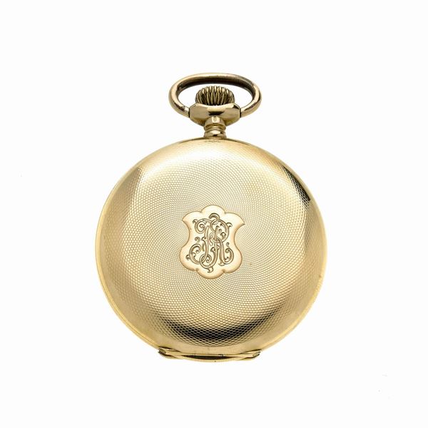 MATERIALE: oro giallo DESCRIZIONE: orologio da tasca con tripla cassa in oro, quadrante in smalto con numeri arabi e lancette piriformi, quadrante ausiliario ad ore sei, movimento a carica manuale, cassa anteriore incisa con cartiglio con iniziali R I J MISURE: diametro cm 5 PESO: gr 104.9