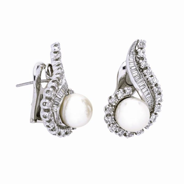 Paio di orecchini a clip in oro bianco, diamanti e perle coltivate